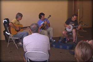 Scott Nygaard, Mike Marshall, and Tony Trischka teaching an improvisation class